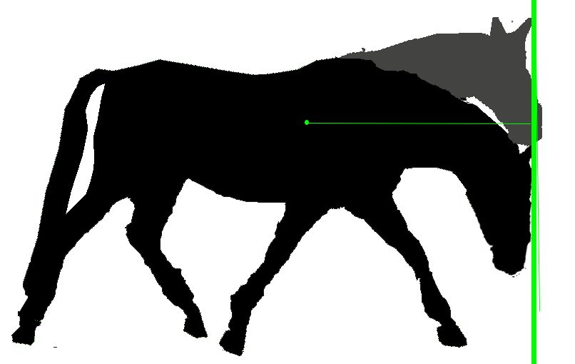 Wie man an den übereinandergelegten Bildern sieht (die Füße des grauen Pferdes sind ausgeblendet), ist der Kopf oben sogar etwas weiter vor dem Schwerpunkt. Ob der Schwerpunkt nun genau am kleinen Kreis ist, ändert an der Physik der Hebelgesetze wenig.