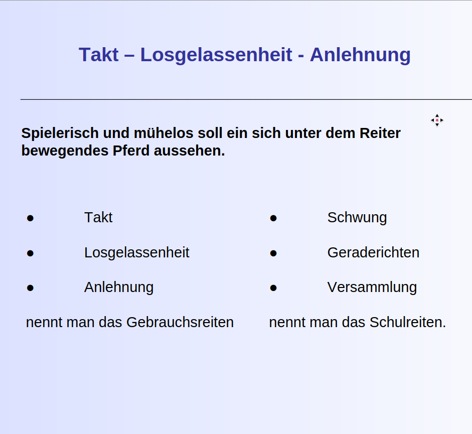 wird erreicht bei Hinzunahme der Seitengänge, also der Dressurausbildung ab Klasse M (Steinbrecht 1886)